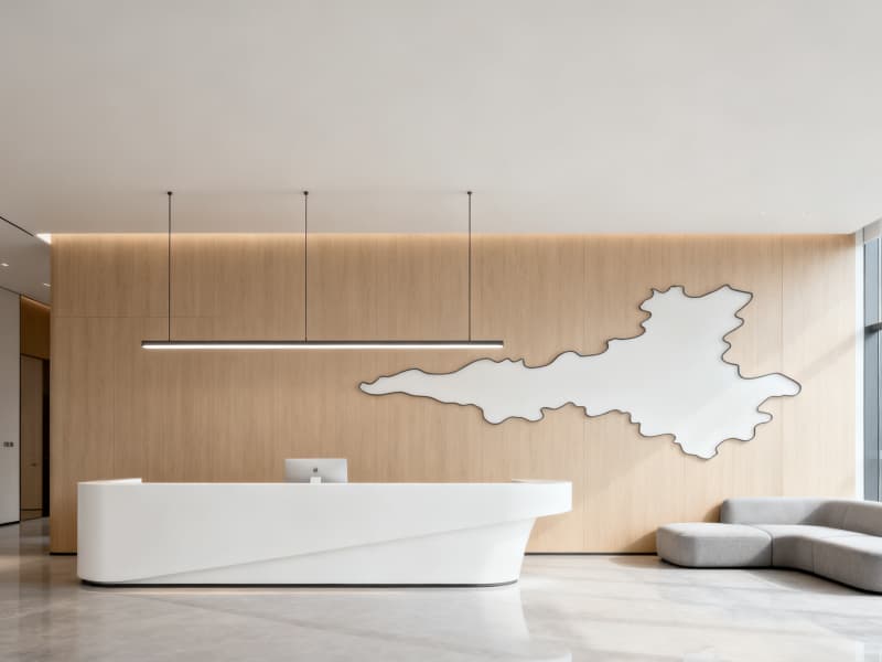 本設(shè)計以滿足辦公功能需求為核心,融合現(xiàn)代簡約風(fēng)格與蚌埠地域文化元素,打造兼具實用性與美觀性的辦公空間。整體空間色彩以淺色系為主,搭配深色點綴,營造清爽、舒適的視覺效果,同時通過落地玻璃窗、線性吊燈等設(shè)計引入充足光線,減少空間壓抑感。?