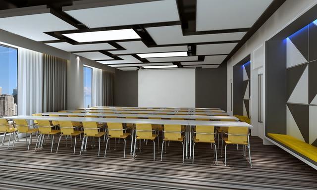 干凈硬朗的員工培訓室設(shè)計,符合這個功能區(qū)緊張而又嚴肅的工作氛圍。右側(cè)設(shè)置有休閑區(qū),搭配幾何造型的立面設(shè)計,可以達到調(diào)節(jié)工作節(jié)奏的效果。