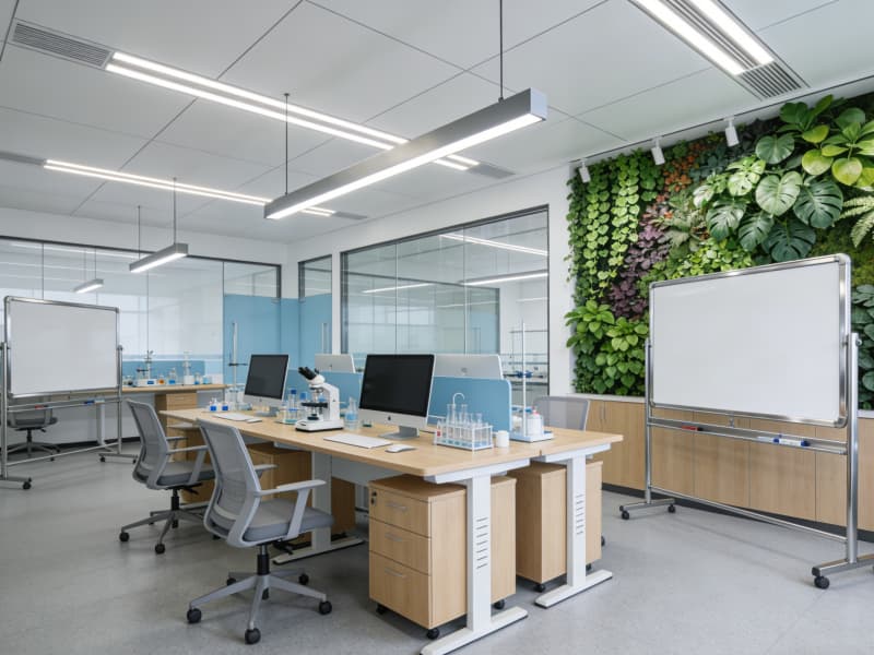 研發(fā)區(qū)營造舒適且富有創(chuàng)意的氛圍。開放式的辦公區(qū)域配備智能升降辦公桌與可移動白板,方便團隊交流與頭腦風(fēng)暴。實驗室采用模塊化設(shè)計,實驗臺布局合理,各類先進儀器有序擺放。通風(fēng)系統(tǒng)保證實驗環(huán)境安全,同時設(shè)置綠植墻,為科研人員舒緩壓力。