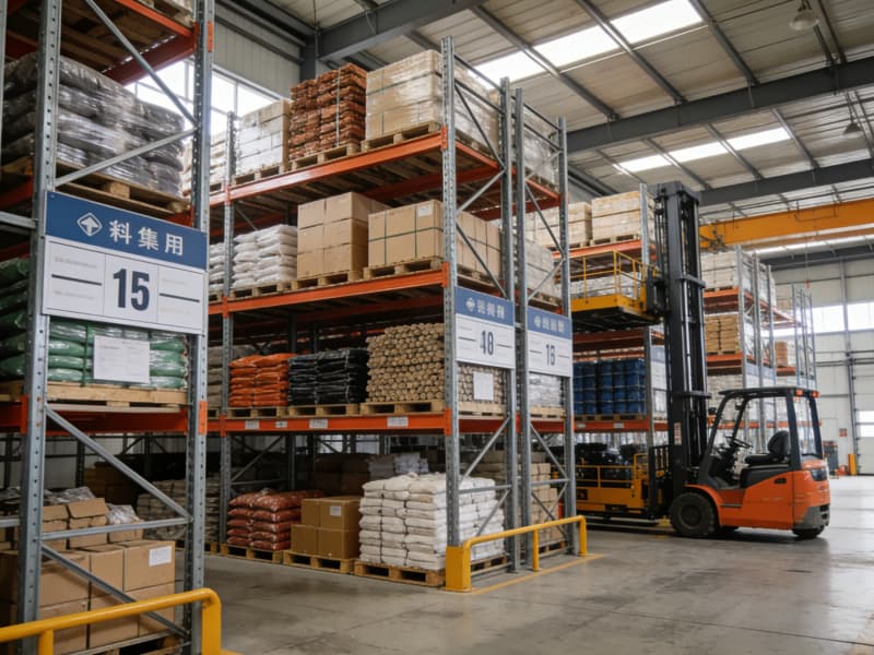 原料存儲區(qū)運用多層式的金屬貨架,將空間進行了充分的垂直利用,不同類型的原料分區(qū)存放,標識清晰,便于管理和取用。同時,配備了先進的搬運設備,提高了貨物的搬運效率。