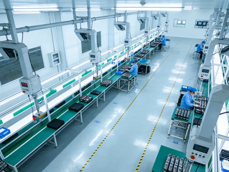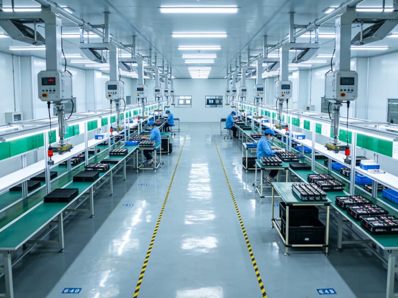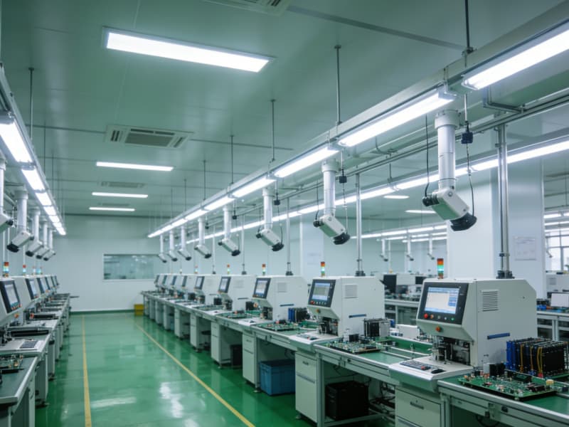 進(jìn)入內(nèi)部,生產(chǎn)區(qū)布局緊湊且合理,采用智能化的懸掛式生產(chǎn)設(shè)備,搭配可調(diào)節(jié)的無(wú)影燈光源,確保生產(chǎn)操作的精準(zhǔn)度。地面使用防靜電地坪,滿足電子設(shè)備生產(chǎn)需求。