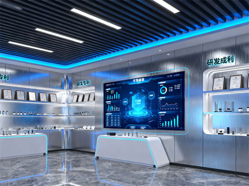 展廳入口處設(shè)置了沉浸式視覺裝置,通過光影效果模擬半導(dǎo)體芯片的微觀結(jié)構(gòu),讓參觀者剛進(jìn)入就能直觀感受到行業(yè)特性。往里走,核心展示區(qū)采用開放式布局,搭配通透的玻璃展柜與懸浮式展臺(tái),既方便參觀者近距離觀察展品,又能讓空間顯得開闊不壓抑。展示區(qū)旁設(shè)置了互動(dòng)體驗(yàn)區(qū),裝修上融入了柔和的木質(zhì)元素,平衡科技感帶來的冷峻,讓參觀者在互動(dòng)過程中更顯舒適。?
